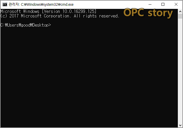 메뉴를 선택하면 해당 사용자 계정의 바탕화면 폴더 위치에서 관리자 권한의 '명령 프롬프트'가 실행됩니다.