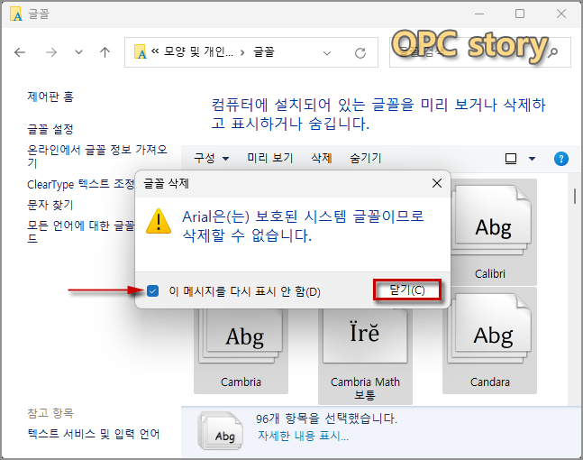 윈도우의 기본 글꼴(폰트)은 삭제가 불가능하다는 메제지 창이 표시되면 '이 메시지를 다시 표시 안 함' 항목에 체크 후 '닫기'를 클릭합니다.